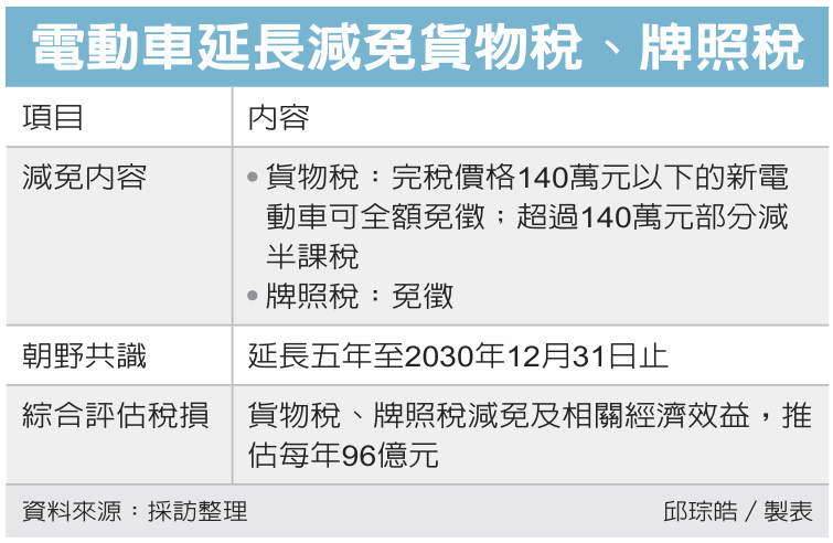 为鼓励购买电动车,财政部提供货物税、使用牌照税减免,原本将于今年12月31日届期。立法院财政委员会昨(16)日朝野协商获共识,将这两项租税减免延长五年至2030年12月31日止,最快周五院会三读。
