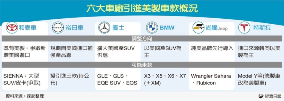 台美对等贸易协定传最快将于本周签署,美规车进口台湾关税可能降至零,美制车大军吹响集结号,六大车厂摩拳擦掌,包括和泰车、裕日车、宾士、BMW、尚腾、特斯拉等,均规划「策略性」引进美制车款。