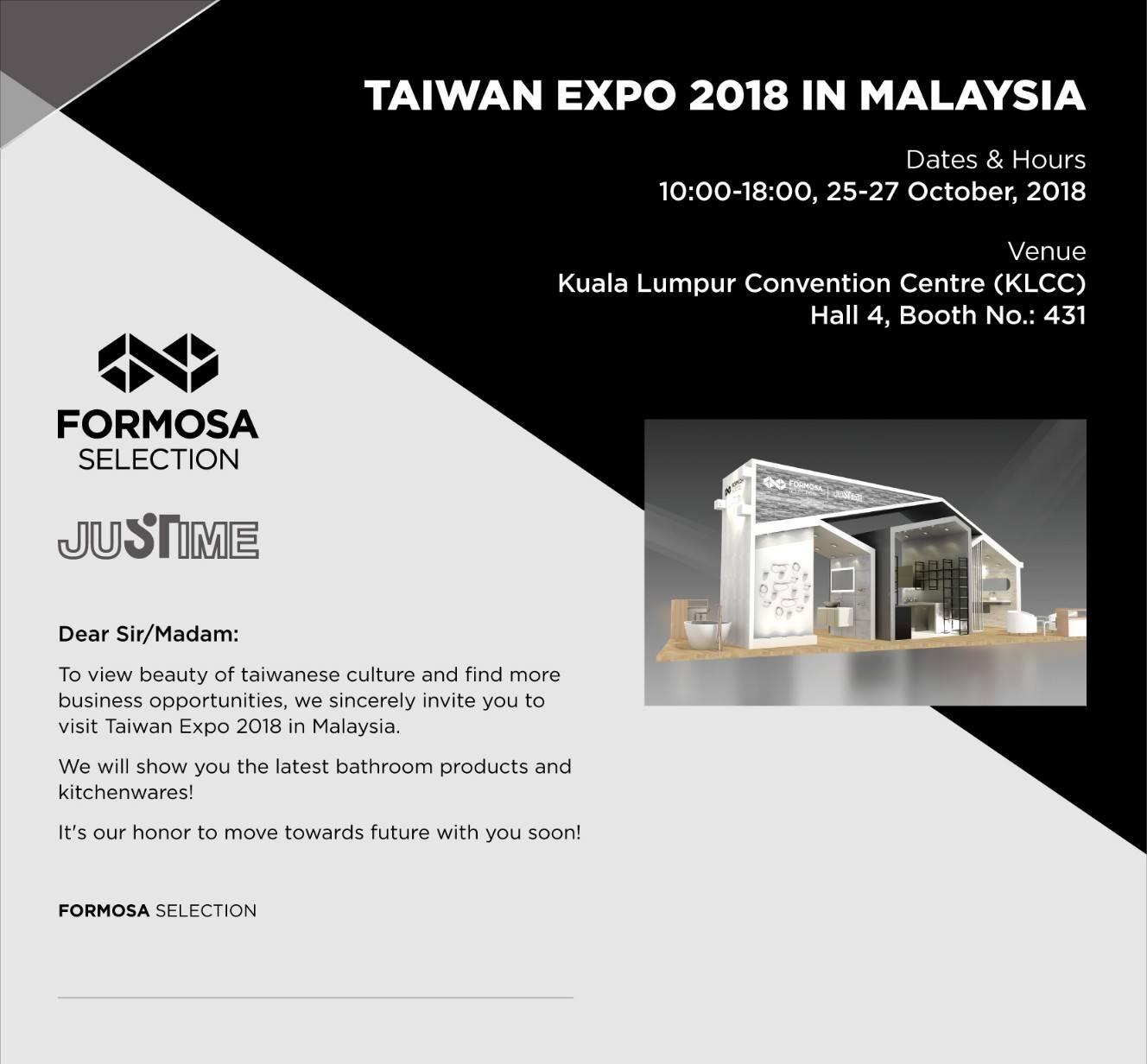Taiwan Expo 2018 in MalaysiaDear Sir/Madam:To view beauty of Taiwanese culture and find more business opportunities, we sincerely invite you to visit Taiwan Expo 2018 in Malaysia.