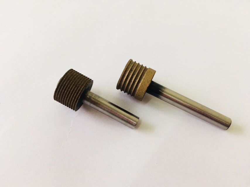 带柄钻石磨棒是用金属烧结式,做沟槽成型倒角研磨用,适合于手机超薄玻璃,超薄陶瓷,的研磨及倒角,此金属烧结磨棒沟槽变形可以重覆修理使用,寿命长。